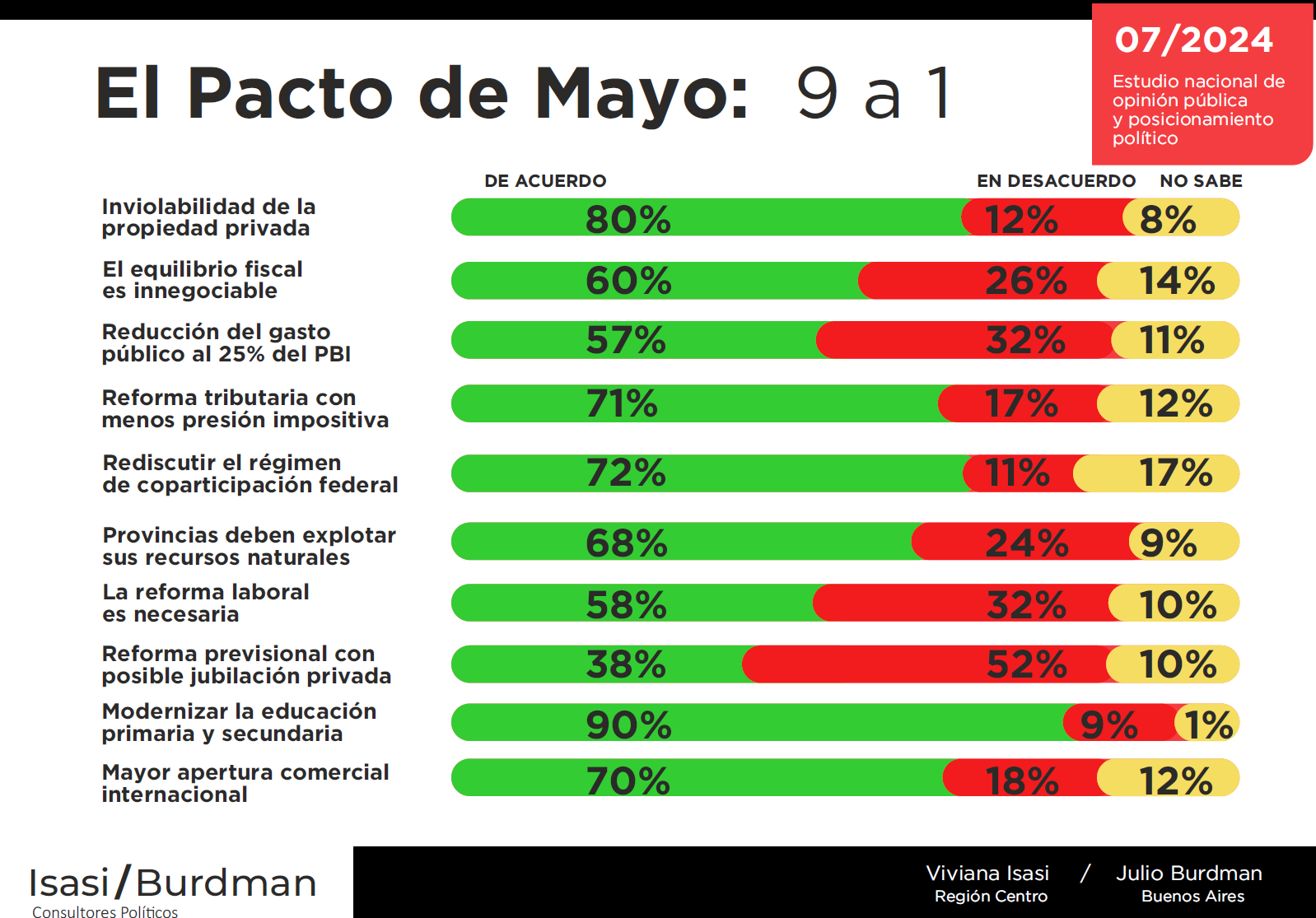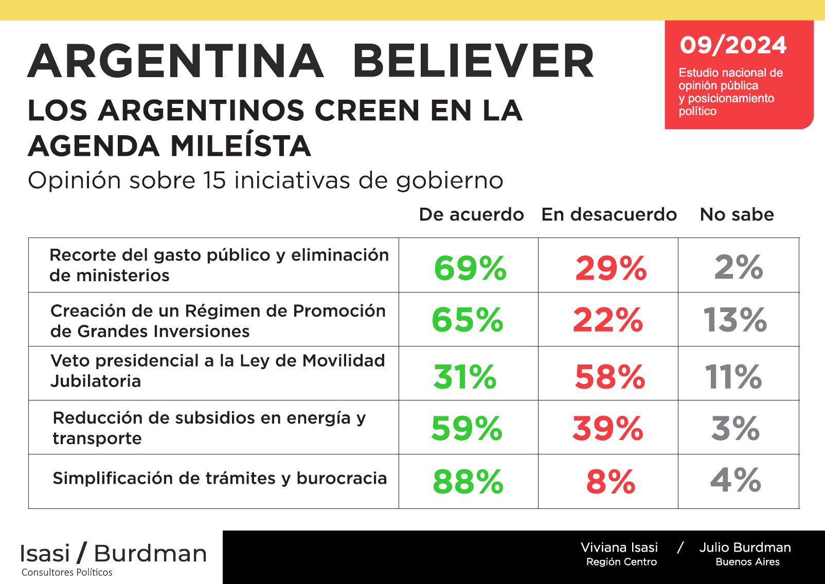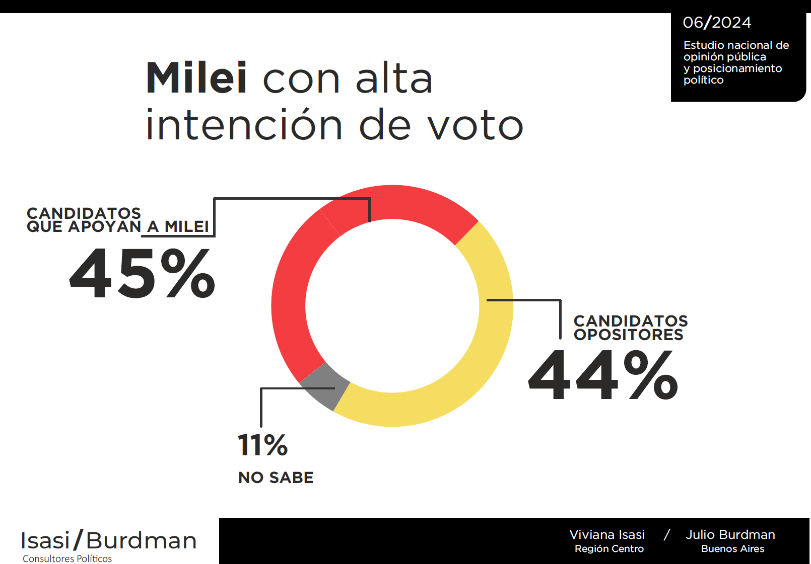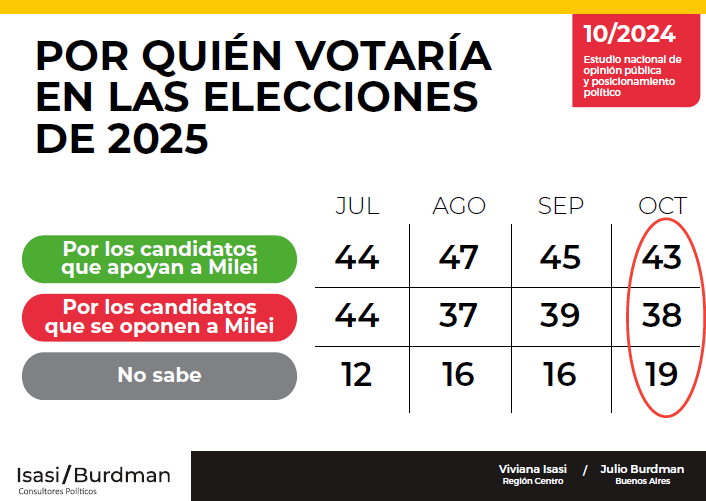 Si las legislativas de 2025 fueran hoy, 45% votaría por "los candidatos de Milei" y 44% por los opositores.
