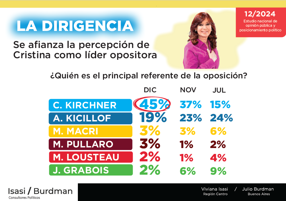 Aunque Kicillof tiene mejor imagen, Cristina Kirchner es percibida como la líder de la oposición política.