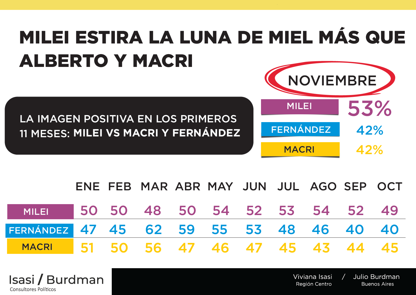 En la comparación de los primeros once meses de Milei, Fernández y Macri, el actual presidente es el que mantiene mayor nivel de apoyo.